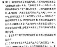 14.(13分)如图为可连发的玩具气枪,其原理是刺用压缩空气将橡皮弹丸弹射出去,气枪构造上有一个汽缸和一个可以向汽缸内充人空气的压缩装置,已知汽缸的体积为0mL每压缩一次压缩装置可以向汽缸内充人40mL的空气,压缩装置充人空气的压强为大气压Pn,当汽加内气体的压颈达到2.5p0时才能实现将10颗橡皮弹丸连结弹时出去,汽缸体积不变,汽缸内空气和压缩装置内的空气均可视为然气体,略充气和弹射过程中汽缸内气体温度的变化。[11求至少充气多少次才能实现格10颗橡皮弹丸连续弹封出去:2.5p3,弹时出橡皮弹丸后漏出空气的质量与发射橡皮弹丸之汽缸内空气的质量之比