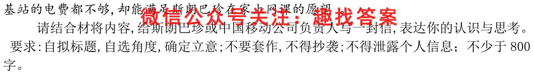 基站的电费都不够,却能满足斯朗巴珍在家上网课的愿望。请结合材将内容,给斯朗巴珍或中国移动公司负责人写一封信,表达你的认识与思考。要求:自拟标题,自选角度,确定立意;不要套作,不得抄袭;不得泄露个人信息;不少于800字。