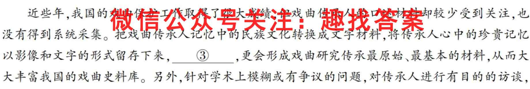 近些年,我国的戏曲保护工作取得了很大成绩,但戏曲传承人的口述材料却较少受到关注,也没有得到系统采集。把戏曲传承人记忆中的民族文化转换成文字材料,将传承人心中的珍贵记忆以影像和文字的形式留存下来,(③,更会形成戏曲研究传承最原始、最基本的材料,从而大大丰富我国的戏曲史料库。另外,针对学术上模糊或有争议的问题,对传承人进行有目的的访谈,对获取的口述资料进行考证和研究,会大大拓展戏曲的研究空间。
