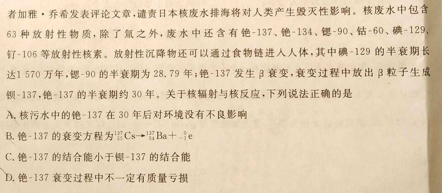 1.2023年7月1日《光明网》消息,南非人文科学研究委员会金砖国家研究中心原主任、知名学者加雅·乔希发表评论文章,谴责日本核废水排海将对人类产生毁灭性影响。核废水中包含63种放射性物质,除了氚之外,废水中还含有铯-137、铯-134、锶-90、钻-60、碘-129、钉-106等放射性核素。放射性沉降物还可以通过食物链进入人体,其中碘-129的半衰期长达1570万年,锶-90的半衰期为28.79年;铯-137发生β衰变,衰变过程中放出β粒子生成钡-137,铯-137的半衰期约30年。关于核辐射与核反应,下列说法正确的是A.核污水中的铯-137在30年后对环境没有不良影响B.铯-137的衰变方程为55^137Cs54^137Ba+-1^0eC.铯-137的结合能小于钡-137的结合能D.铯-137衰变过程中不一定有质量亏损