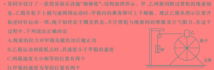 *某同学设计了一款简易娱乐设施“颠颠轮”,结构如图所示。甲、乙两箱用跨过滑轮的绳索相连,乙箱在轮子上做匀速圆周运动时,甲箱内的乘客即可上下颠簸。现让乙箱从图示位置开始逆时针运动一周,绳子始终处于绷直状态,不计滑轮与绳索间的摩擦及空气阻力,在这个过程中,下列说法正确的是A.绳索的拉力对甲箱先做负功后做正功B.乙箱运动到最低点时,其速度小于甲箱的速度C.两箱速度大小相等的位置有两个D.甲箱的速度为零的位置有两个