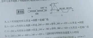 7.图甲为某市地铁3号线部分行程图,图乙为某班列车行驶的图像。下列说法正确的是18044A.从0时刻起列车从双龙一南联一龙城广场B0240s内列车从南联一·双龙,240s∼360s停车,360s∼620s从双龙→南联C.0~-240s内列车从南联一双龙,240s∼360s停车,360s620s从双龙→龙城广场D.0∼240s.350s-440s.540s≈620s三段时间内列车的加速度大小相同