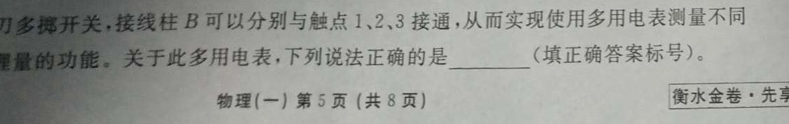 丙(1)如图甲所示为某实验小组设计的多用电表的原理示意图。虚线框中S为一个单刀多掷开关,接线柱B可以分别与触点1、2、3接通,从而实现使用多用电表测量不同物理量的功能。关于此多用电表,下列说法正确的是(填正确答案标号)。A.当S接触点1时,多用电表处于测量电流的挡位B.当S接触点2时,多用电表处于测量电压的挡位C.当S接触点2时,多用电表处于测量电阻的挡位D.当S接触点3时,多用电表处于测量电压的挡位