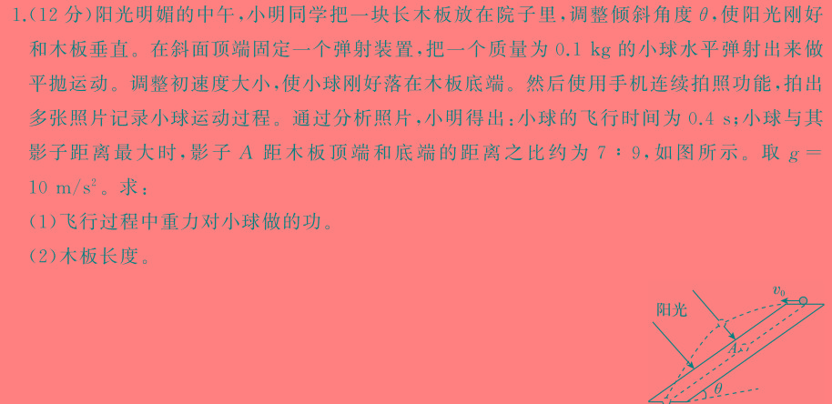 1.(12分)阳光明媚的中午,小明同学把一块长木板放在院子里,调整倾斜角度0,使阳光刚好和木板垂直。在斜面顶端固定一个弹射装置,把一个质量为0.1kg的小球水平弹射出来做平抛运动。调整初速度大小,使小球刚好落在木板底端。然后使用手机连续拍照功能,拍出多张照片记录小球运动过程。通过分析照片,小明得出:小球的飞行时间为0.4s;小球与其影子距离最大时,影子A距木板顶端和底端的距离之比约为7:9,如图所示。取g=10m/s^2。。求:(1)飞行过程中重力对小球做的功。(2)木板长度。
