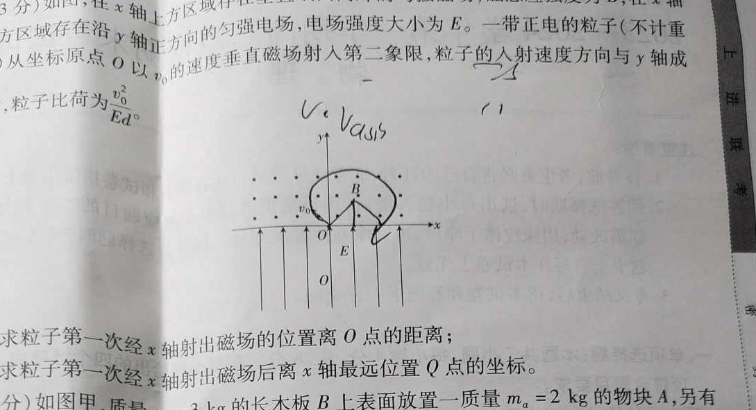 14.(13分)如图,在x轴上方区域存在垂直纸面向外的匀强磁场,磁感应强度为B,在x轴下方区域存在沿y轴方向的匀强电场,电场强度大小为E。一带正电的粒子(不计重力)从坐标原点O以的速度垂直磁场射人第二象限,粒子的入射速度方向与y轴成v045^,45°,粒子比荷为v0^2Ed(1)求粒子第一次经x轴射出磁场的位置离0点的距离;x(2)求粒子第一次经x轴射出磁场后离x轴最远位置Q点的坐标。
