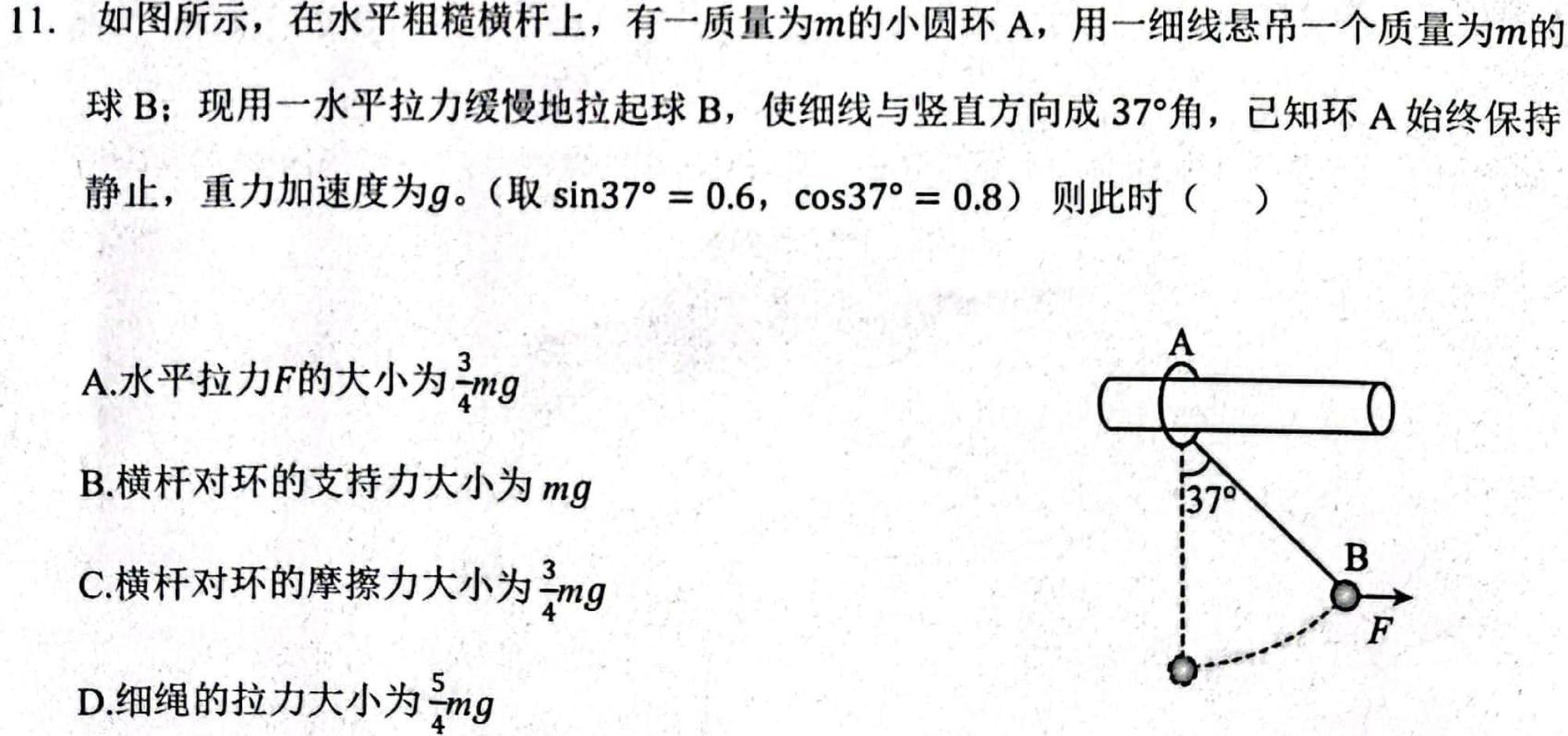 11.如图所示,在水平粗糙横杆上,有一质量为m的小圆环A,用一细线悬吊一个质量为m的球B;现用一水平拉力缓慢地拉起球B,使细线与竖直方向成37^角,已知环A始终保持静止,重力加速度为g。(取37^=0.6,37^=0.8)则此时()A.水平拉力F的大小为34mgB.横杆对环的支持力大小为mgmgC.横杆对环的摩擦力大小为34mgD.细绳的拉力大小为54mg