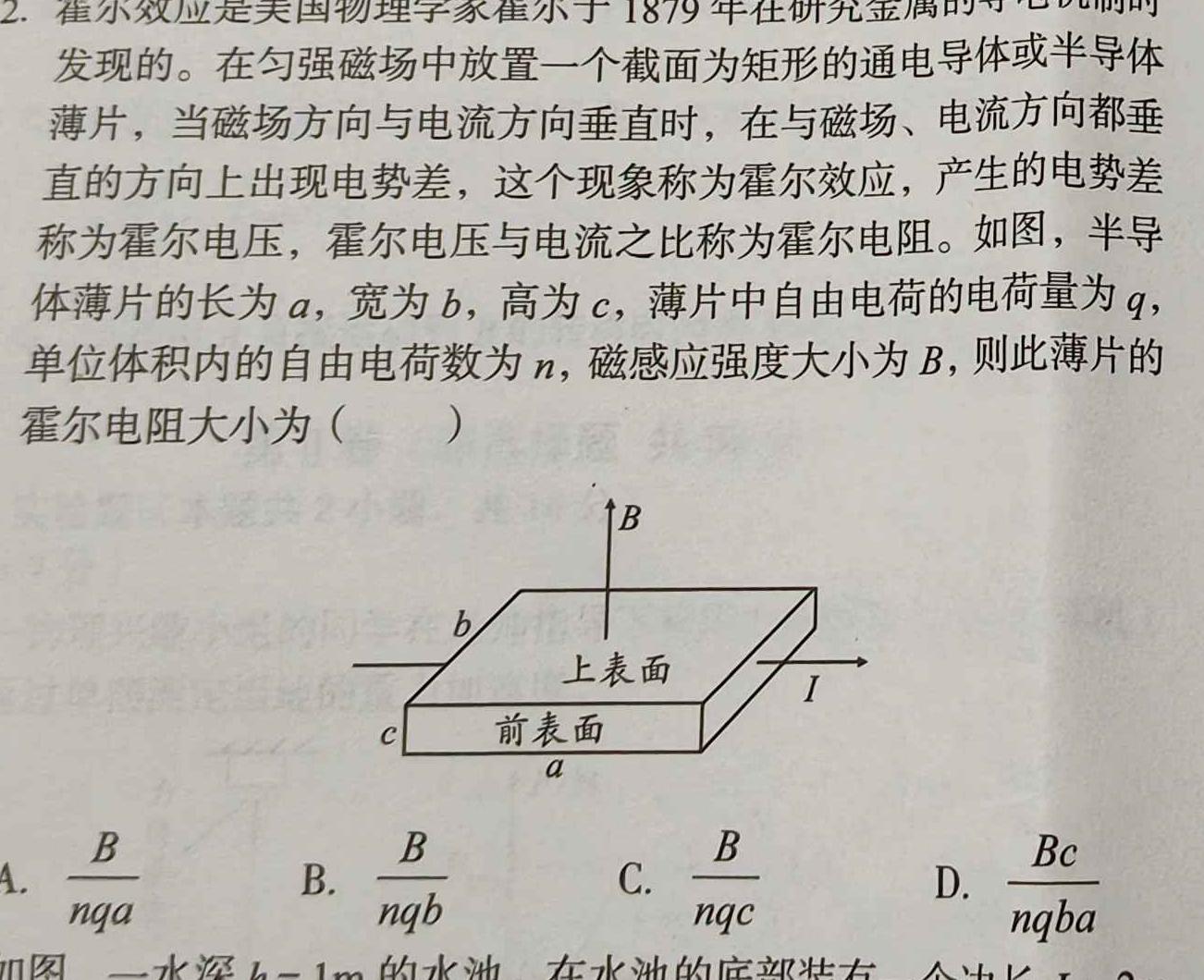 2.霍尔效应是美国物理学家霍尔于1879年在研究金属的导电机制时发现的。在匀强磁场中放置一个截面为矩形的通电导体或半导体薄片,当磁场方向与电流方向垂直时,在与磁场、电流方向都垂直的方向上出现电势差,这个现象称为霍尔效应,产生的电势差称为霍尔电压,霍尔电压与电流之比称为霍尔电阻。如图,半导体薄片的长为a,宽为b,高为c,,薄片中自由电荷的电荷量为q,单位体积内的自由电荷数为n,,磁感应强度大小为B,则此薄片的霍尔电阻大小为()A.BnqaB.BnqbC.Bnqc