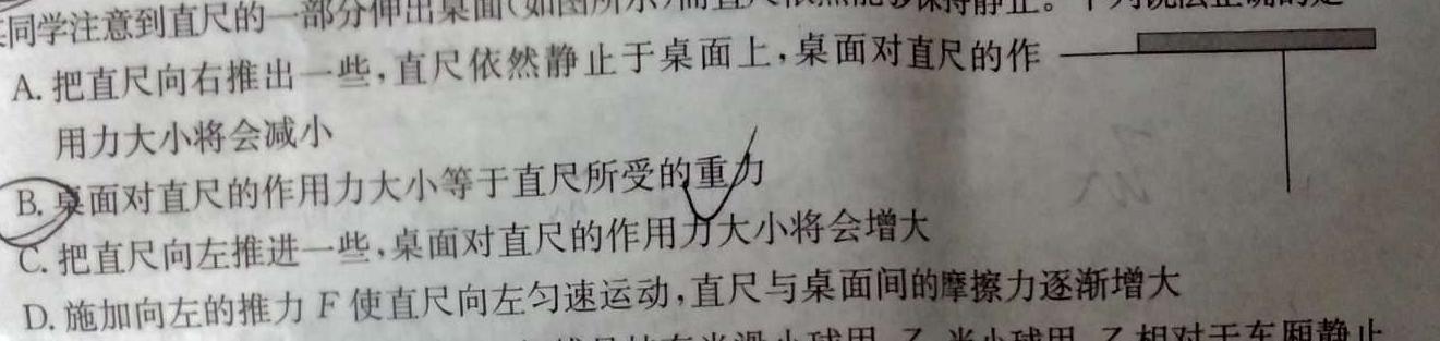 6.某同学注意到直尺的一部分伸出桌面(如图所示)而直尺依然能够保持静止。下列说法正确的是A.把直尺向右推出一些,直尺依然静止于桌面上,桌面对直尺的作用力大小将会减小B.桌面对直尺的作用力大小等于直尺所受的重力C..把直尺向左推进一些,桌面对直尺的作用力大小将会增大D.施加向左的推力F使直尺向左匀速运动,直尺与桌面间的摩擦力逐渐增大