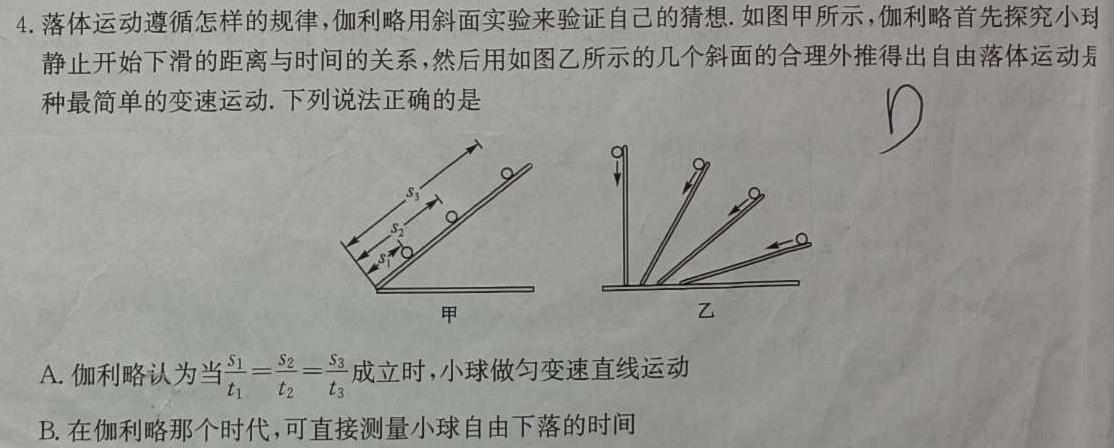 4.落体运动遵循怎样的规律,伽利略用斜面实验来验证自己的猜想.如图甲所示,伽利略首先探究小球静止开始下滑的距离与时间的关系,然后用如图乙所示的几个斜面的合理外推得出自由落体运动种最简单的变速运动.下列说法正确的是0A.伽利略认为当S1t1=S2t2=S3t3成立时,小球做匀变速直线运动B.在伽利略那个时代,可直接测量小球自由下落的时间C.标利略用图D.伽利略把斜