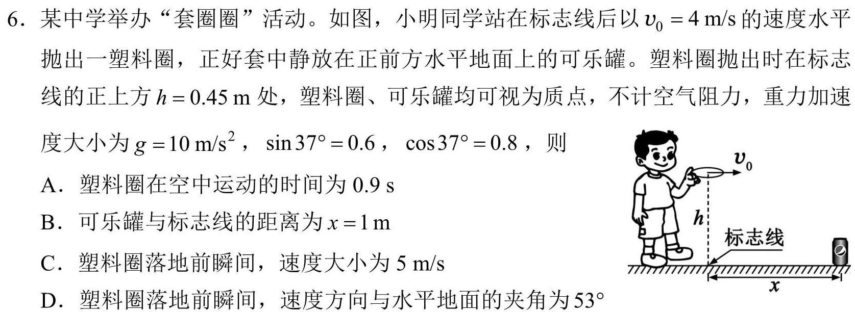 6.某中学举办“套圈圈”活动。如图,小明同学站在标志线后以v0=4m/s的速度水平抛出一塑料圈,正好套中静放在正前方水平地面上的可乐罐。塑料圈抛出时在标志线的正上方h=0.45m处,塑料圈、可乐罐均可视为质点,不计空气阻力,重力加速度大小为g=10m/s^2,37^=0.6,37^=0.8,则A.塑料圈在空中运动的时间为0.9sB.可乐罐与标志线的距离为x=1mC.塑料圈落地前瞬间,速度大小为5m/sD.塑料圈落地前瞬间,速度方向与水平地面的夹角为53^