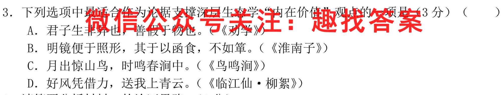 3.下列选项中最适合作为论据支撑深层生态学“内在价值”观点的一项是(3分)()A.君子生非异也,善假于物也。(《劝学》)B.明镜便于照形,其于以函食,不如。(《淮南子》)C.月出惊山鸟,时鸣春涧中。(《鸟鸣涧》)D.好风凭借力,送我上青云。(《临江仙·柳絮》)