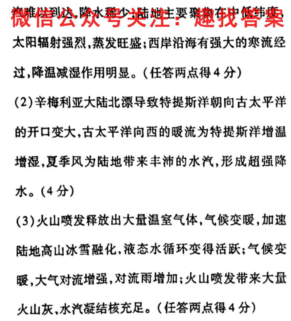 汽难以到达,降水稀少;陆地主要聚集在中低纬度,太阳辐射强烈,蒸发旺盛;西岸沿海有强大的寒流经过,降温减湿作用明显。(任答两点得4分)(2)辛梅利亚大陆北漂导致特提斯洋朝向古太平洋的开口变大,古太平洋向西的暖流为特提斯洋增温增湿,夏季风为陆地带来丰沛的水汽,形成超强降水。(4分)(3)火山喷发释放出大量温室气体,气候变暖,加速陆地高山冰雪融化,液态水循环变得活跃;气候变暖,大气对流增强,对流雨增加;火山喷发带来大量火山灰、水汽凝结核充足。(任答两点得4分)