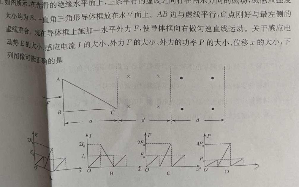 10.如图所示,在光滑的绝缘水平面上,三条平行的虚线之间存在图示方向的磁场,磁感应强度大小均为B,一直角三角形导体框放在水平面上。AB边与虚线平行,C点刚好与最左侧的虚线重合,现在导体框上施加一水平外力F,使导体框向右做匀速直线运动。关于感应电动势E的大小感应电流I的大小、外力F的大小、外力的功率P的大小、位移x的大小,下x^4列图像可能正确的是E