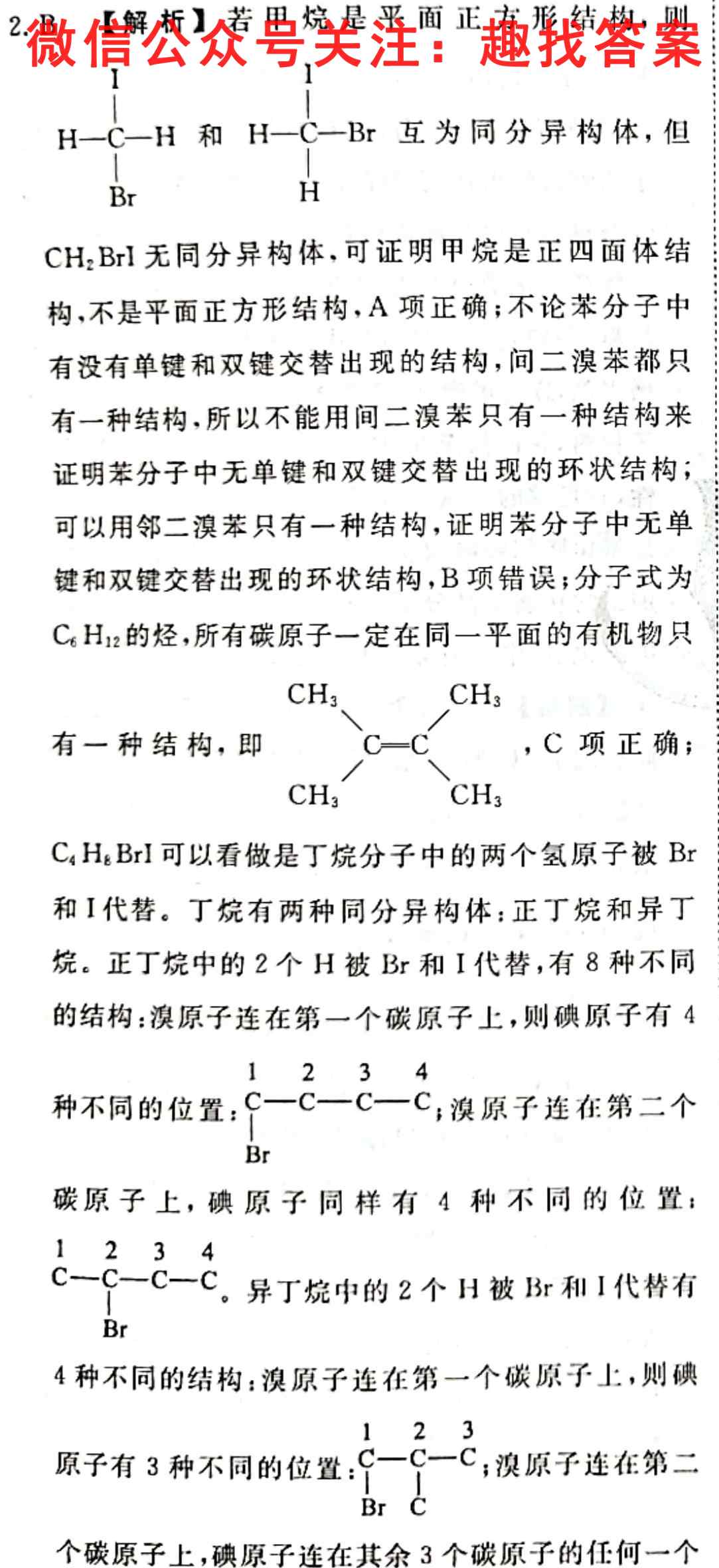 2.B 【解析】若甲烷是平面正方形结构,则C H _ { 2 } B r I无同分异构体,可证明甲烷是正四面体结构,不是平面正方形结构,A项正确;不论苯分子中有没有单键和双键交替出现的结构,间二溴苯都只有一种结构,所以不能用间二溴苯只有一种结构来证明苯分子中无单键和双键交替出现的环状结构;可以用邻二溴苯只有一种结构,证明苯分子中无单键和双键交替出现的环状结构,B项错误;分子式为C _ { 6 } H _ { 1 2 }的烃,所有碳原子一定在同一平面的有机物只有一种结构,即,C 项正确;C _ { 4 } H _ { k } B r I可以看做是丁烷分子中的两个氢原子被Br和I代替。丁烷有两种同分异构体:正丁烷和异丁烷。正丁烷中的2个H被Br和I代替,有8种不同的结构:溴原子连在第一个碳原子上,则碘原子有4 1 23 4种不同的位置: 一^{∘}C—C–C溴原子连在第二个B碳原子上,碘原子同样有4 种不同的位置:异丁烷中的2个H被Br和I代替有4种不同的结构:溴原子连在第一个碳原子上,则碘1 2 3原子有3种不同的位置:C C;溴原子连在第二Brr C个碳原子上,碘原子连在其余3个碳原子的任何一个 Br碳原子都相同,只有1种位置:CC ,所以共有C12种同分异构体,D项正确。