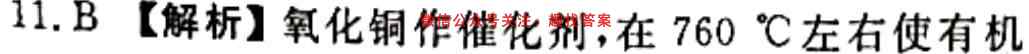 11.B【解析】氧化铜作催化剂,在760^C左右使有机物在氧气流中全部氧化为CO2和H2O,通过测定生成的CO2、H2O的量确定实验式,用氯化钙吸收水蒸气,用碱石灰吸收二氧化碳,由于碱石灰会同时吸收水蒸气和二氧化碳,故先用氯化钙吸收水蒸气,再用碱石灰吸收二氧化碳;计算生成水、二氧化碳的物质的量,根据质量守恒判断是否含有O元素,若含有O元素,计算原子物质的量;根据原子数目之比确定有机物最简式,再确定分子式,最后根据有机物A的核磁共振氢谱确定结构简式,B项错误。