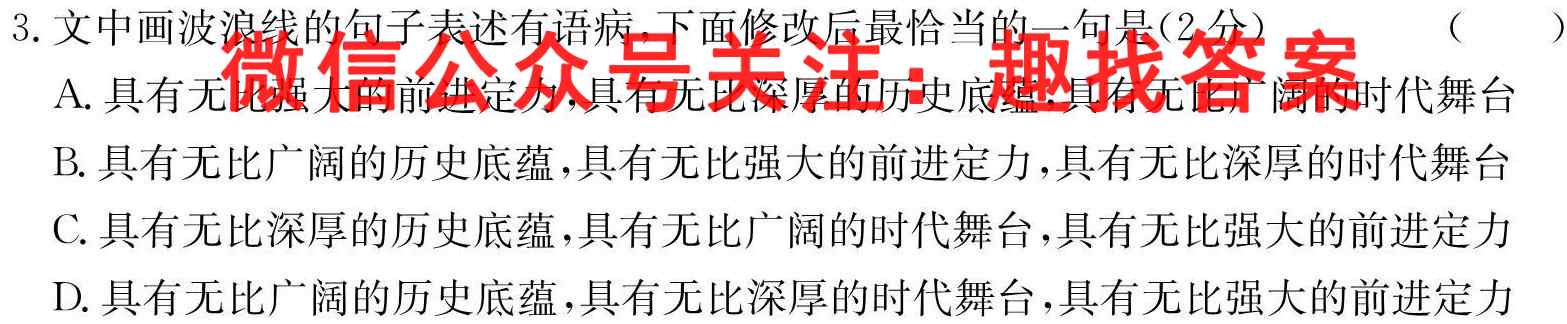 3.文中画波浪线的句子表述有语病,下面修改后最恰当的一句是(2分)()A.具有无比强大的前进定力,具有无比深厚的历史底蕴,具有无比广阔的时代舞台B.具有无比广阔的历史底蕴,具有无比强大的前进定力,具有无比深厚的时代舞台C.具有无比深厚的历史底蕴,具有无比广阔的时代舞台,具有无比强大的前进定力D.具有无比广阔的历史底蕴,具有无比深厚的时代舞台,具有无比强大的前进定力