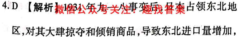 4.D 【解析】1931年九一八 事变后,日本占领东北地区,对其大肆掠夺和倾销商品,导致东北进口量增加, 税率降低,说明国家主权影响经济发展,故选D项;材料中只有进口量,无法看出对外贸易处于出超地位,排除A项;日本对东北的经济侵略不利于民族资本主义的发展,排除B项;经济危机期间,各主要资本主义国家加紧了对殖民地和半殖民地国家的掠夺和商品倾销,而从图中可以看出关内的进口量在逐年降低,说明其受经济危机影响相对较小而非更严重,排除C项。