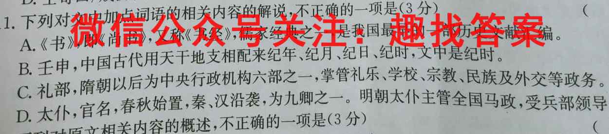 下列对文中加点词语的相关内容的解说,不正确的一项是(3分)(A.《书》,即《尚书》,又称《书经》,儒家经典之一,是我国最早的一部历史中国古代用天干地支相配来纪年、纪月、纪日、纪时,文中是纪时。C.礼部,隋朝以后为中央行政机构六部之一,掌管礼乐、学校、宗教、民族及外交等政务。DD.太仆,官名,春秋始置,秦、汉沿袭,为九卿之一。明朝太仆主管全国马政,受兵部领导(