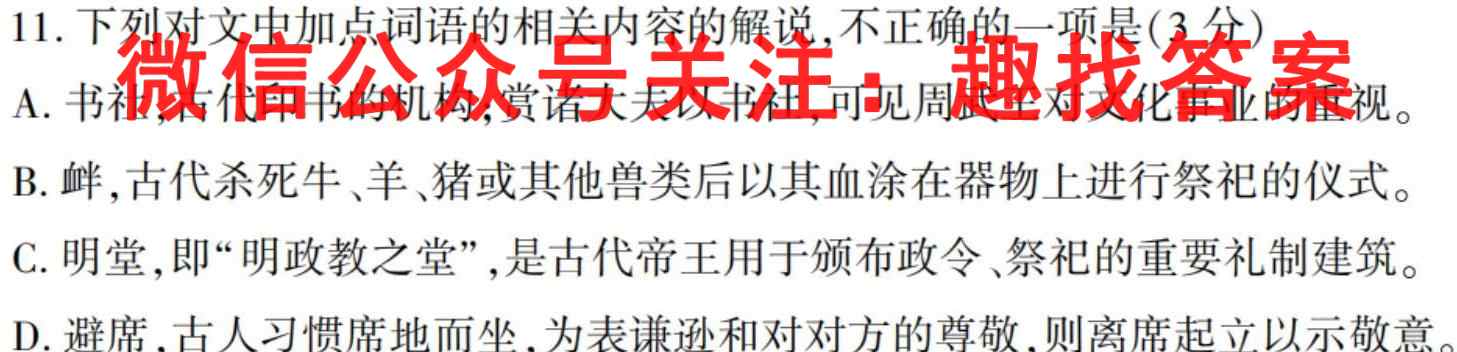 11.下列对文中加点词语的相关内容的解说,不正确的一项是(3分)A.书社,古代印书的机构;赏诸大夫以书社,可见周武王对文化事业的重视。B.衅,古代杀死牛、羊、猪或其他兽类后以其血涂在器物上进行祭祀的仪式。C.明堂,即“明政教之堂”,是古代帝王用于颁布政令、祭祀的重要礼制建筑。D.避席,古人*惯席地而坐,为表谦逊和对对方的尊敬,则离席起立以示敬意。