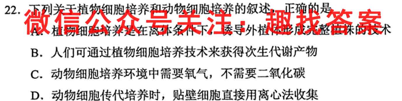 22.下列关于植物细胞培养和动物细胞培养的叙述,正确的是A.植物细胞培养是在离体条件下,诱导外植体形成完整植株的技术B.人们可通过植物细胞培养技术来获得次生代谢产物C.动物细胞培养环境中需要氧气,不需要二氧化碳D.动物细胞传代培养时,贴壁细胞直接用离心法收集