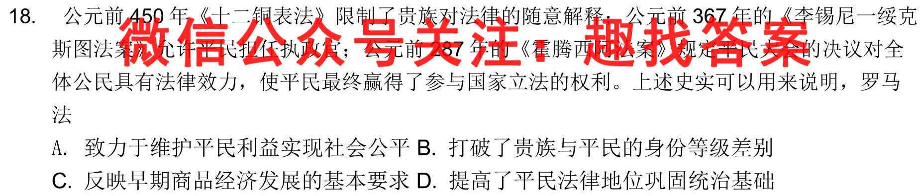 18.公元前450年《十二铜表法》限制了贵族对法律的随意解释;公元前367年的《李锡尼一绥克斯图法案》允许平民担任执政官;公元前287年的《霍腾西阿法案》规定平民大会的决议对全体公民具有法律效力,使平民最终赢得了参与国家立法的权利。上述史实可以用来说明,罗马法A.致力于维护平民利益实现社会公平B.打破了贵族与平民的身份等级差别C.反映早期商品经济发展的基本要求D.提高了平民法律地位巩固统治基础
