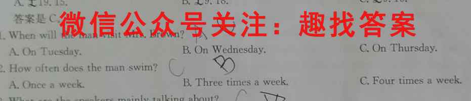 A.£19.15, B.£9.18. C.£9.15.答案是C.1. When will the man visit Mrs. Brown?A. On Tuesday. B.On Wednesday. C.On Thursday.2. How often does the man swim? CA. Once a week. B. Three times a week. C. Four times a week.