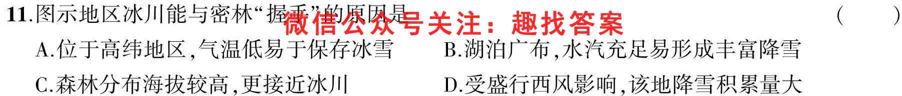 11.图示地区冰川能与密林“握手”的原因是()A.位于高纬地区,气温低易于保存冰雪B.湖泊广布,水汽充足易形成丰富降雪C.森林分布海拔较高,更接近冰川D.受盛行西风影响,该地降雪积累量大