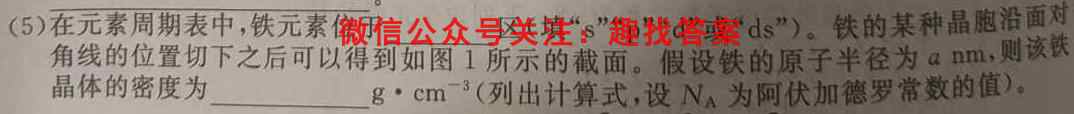 。(5)在元素周期表中,铁元素位于区(填“s”“p”“d”或“ds”)。铁的某种晶胞沿面对ds^9)。角线的位置切下之后可以得到如图1所示的截面。假设铁的原子半径为anm,则该铁gcm^-3晶体的密度为g·cm(列出计算式,设N为阿伏加德罗常数的值)。NA