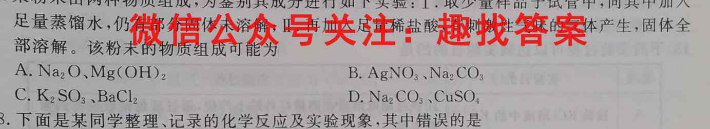 7.某粉末由两种物质组成,为鉴别其成分进行如下实验:I.取少量样品于试管中,向其中加入足量蒸馏水,仍有部分固体未溶解;Ⅱ.再加入足量稀盐酸,有刺激性气味的气体产生,固体全部溶解。该粉末的物质组成可能为A.Na2O、Mg(OH)2B.AgNO3、Na2CO3C.K2SO3、BaCl2D.Na2CO3、CuSO4
