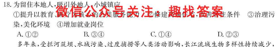 18.为留住本地人,吸引外地人,小城镇应①提升以教育、医疗为核心的公共服务能力②修建高端住宅,改善居住条件③治理污染,美化环境④增加就业岗位A.①②B.③④C.①④D.②③