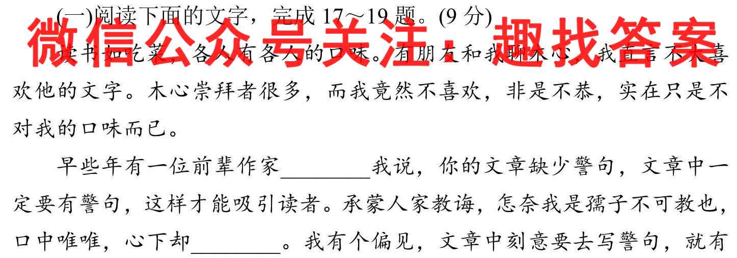 (一)阅读下面的文字,完成17~19题。(9分)读书如吃菜,各人有各人的口味。有朋友和我聊木心,我直言不大喜欢他的文字。木心崇拜者很多,而我竟然不喜欢,非是不恭,实在只是不对我的口味而已。早些年有一位前辈作家我说,你的文章缺少警句,文章中一定要有警句,这样才能吸引读者。承蒙人家教诲,怎奈我是孺子不可教也,口中唯唯,心下却。我有个偏见,文章中刻意要去写警句,就有