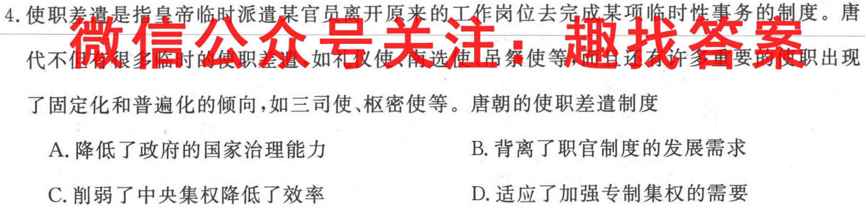 4.使职差遣是指皇帝临时派遣某官员离开原来的工作岗位去完成某项临时性事务的制度。唐代不但有很多临时的使职差遣,如礼仪使、南选使、吊祭使等,而且还有许多重要的使职出现了固定化和普遍化的倾向,如三司使、枢密使等。唐朝的使职差遣制度A.降低了政府的国家治理能力B.背离了职官制度的发展需求C.削弱了中央集权降低了效率D.适应了加强专制集权的需要