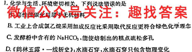 1.化学与生活、环境密切相关。下列说法错误的是A.高性能碳化硅瓜于无机材料B.工业上合成氯乙烷采用加成反应比采用取代反应更符合绿色化学理念C.发酵粉中含有的NaHCO3,能使焙制出的糕点疏松多孔D.《鹤林玉露·一线斩史》:水滴石穿、水滴石穿只包含物理变化