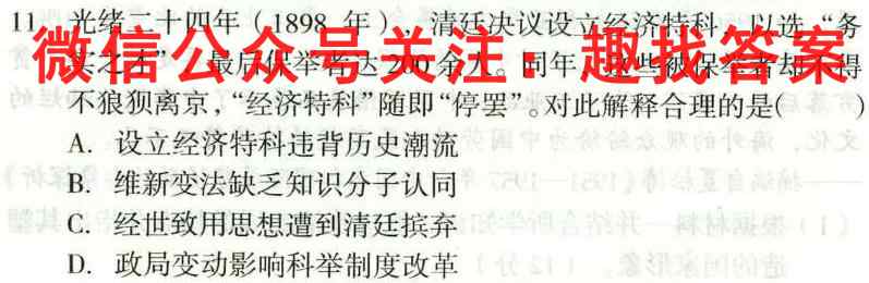 11.光绪二十四年(1898年),清廷决议设立经济特科,以选“务实之才”,最后保举者达200余人。同年,这些被保举者却不得不狼狈离京,“经济特科”随即“停罢”。对此解释合理的是()A.设立经济特科违背历史潮流B.维新变法缺乏知识分子认同C.经世致用思想遭到清廷摈弃D.政局变动影响科举制度改革