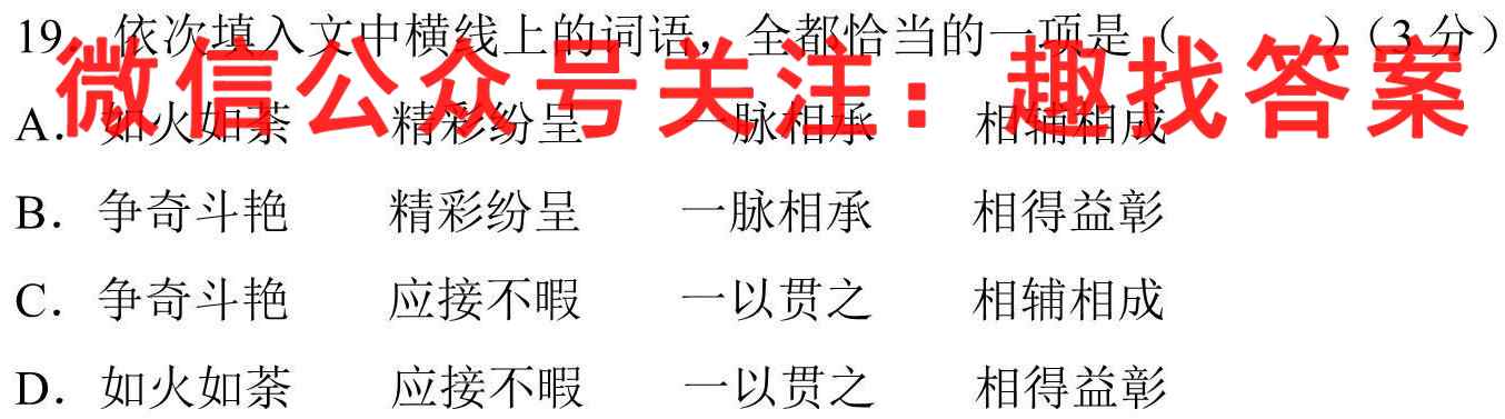 19.依次填入文中横线上的词语,全都恰当的一项是()(3分)A.如火如荼精彩纷呈一脉相承相辅相成B.争奇斗艳精彩纷呈一脉相承相得益彰C.争奇斗艳应接不暇一以贯之相辅相成D.如火如荼应接不暇一以贯之相得益彰