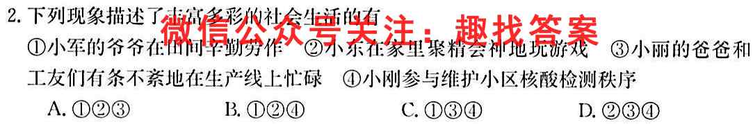 2.下列现象描述了丰富多彩的社会生活的有①小军的爷爷在田间辛勤劳作②小东在家里聚精会神地玩游戏③小丽的爸爸和工友们有条不紊地在生产线上忙碌④小刚参与维护小区**检测秩序A.①②③B.①②④C.①③④D.②③④