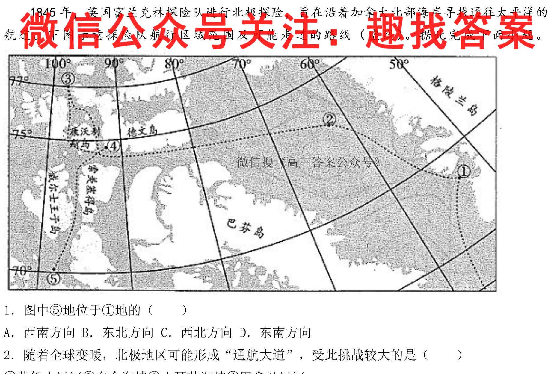 1845年,英国富兰克林探险队进行北极探险,旨在沿着加拿大北部海岸寻找通往太平洋的航道。下图示意探险队航行区域范围及可能走过的路线(虚线)。据此完成下面小题。1.图中⑤地位于①地的()A.西南方向B.东北方向C.西北方向D.东南方向