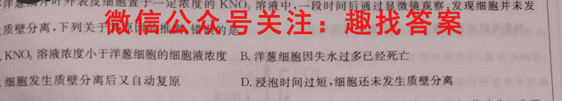 4.将洋叶外表皮细胞置于一定浓度的KNO3溶液中,一段时间后通过显微镜观察,发现细胞并未发生质壁分离,下列关于其原因的推测,错误的是A.KNO3A.KNO,溶液浓度小于洋葱细胞的细胞液浓度B.洋葱细胞因失水过多已经死亡C.细胞发生质壁分离后又自动复原D.浸泡时间过短,细胞还未发生质壁分离