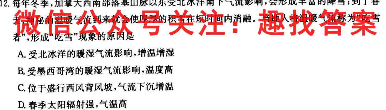 12.每年冬季,加拿大西南部落基山脉以东受北冰洋南下气流影响,会形成丰富的降雪;到了春天,神秘的温暖气流到来就会使厚厚的积雪在短时间内消融。当地人将温暖气流称为“吃雪者”,形成“吃雪”现象的原因是A.受北冰洋的暖湿气流影响,增温增湿B.受墨西哥湾的暖湿气流影响,温度高C.位于盛行西风背风坡,气流下沉增温D.春季太阳辐射强,气温高