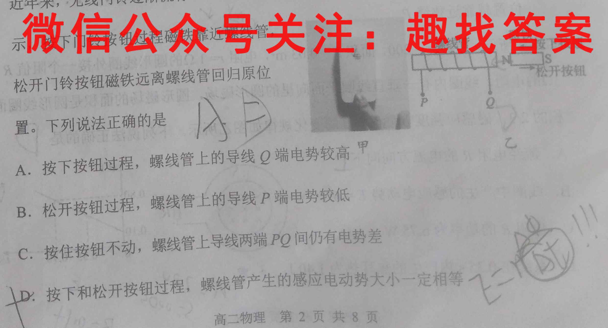 5.近年来,无线门铃逐渐流行。图甲为某款无线门铃按钮,其“自发电”原理如图乙所示,按下门铃按钮过程磁铁靠近螺线管,松开门铃按钮磁铁远离螺线管回归原位置。下列说法正确的是A.按下按钮过程,螺线管上的导线端电势较高甲B.松开按钮过程,螺线管上的导线P端电势较低C.按住按钮不动,螺线管上导线两端PQ间仍有电势差