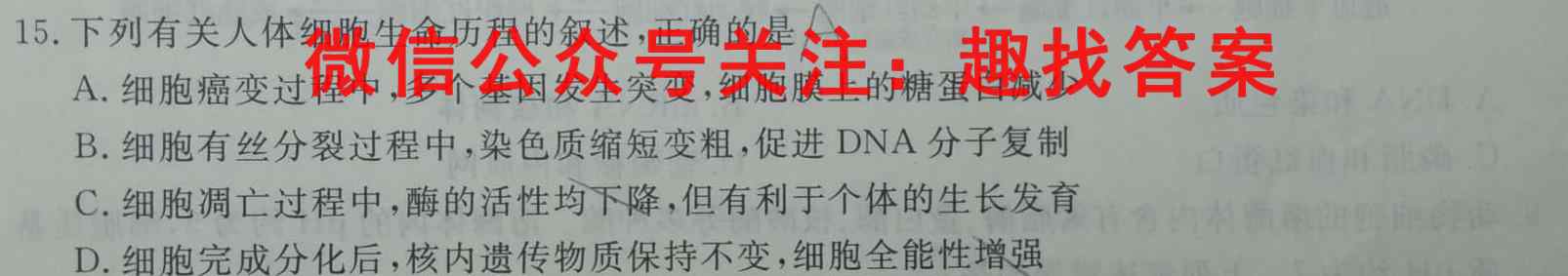 15.下列有关人体细胞生命历程的叙述,正确的是AA.细胞癌变过程中,多个基因发生突变,细胞膜上的糖蛋白减少B.细胞有丝分裂过程中,染色质缩短变粗,促进DNA分子复制C.细胞凋亡过程中,酶的活性均下降,但有利于个体的生长发育D.细胞完成分化后,核内遗传物质保持不变,细胞全能性增强