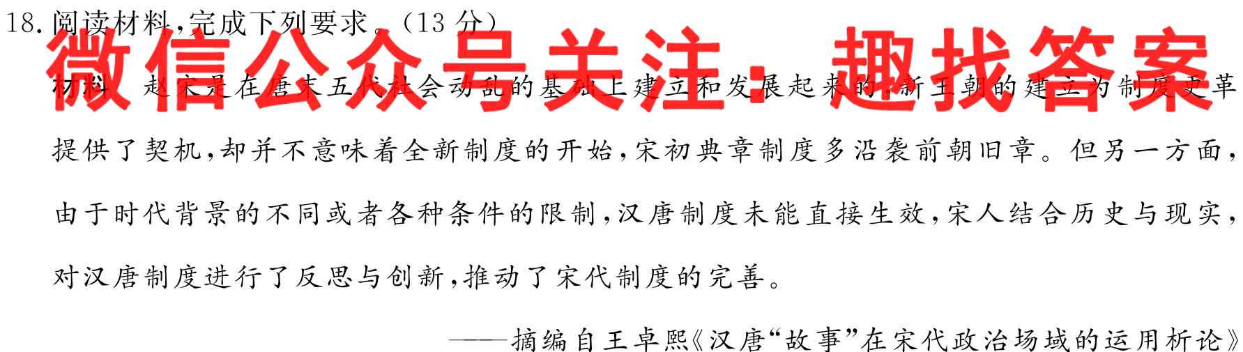 18.阅读材料,完成下列要求。(13分)材料赵宋是在唐末五代社会动乱的基础上建立和发展起来的,新王朝的建立为制度更革提供了契机,却并不意味着全新制度的开始,宋初典章制度多沿袭前朝旧章。但另一方面,由于时代背景的不同或者各种条件的限制,汉唐制度未能直接生效,宋人结合历史与现实,对汉唐制度进行了反思与创新,推动了宋代制度的完善。——摘编自王卓熙《汉唐“故事”在宋代政治场域的运用析论》