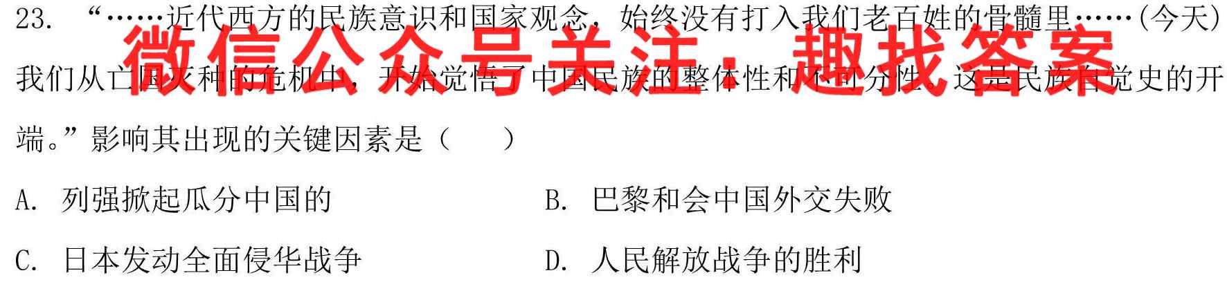 23.“……近代西方的民族意识和国家观念,始终没有打入我们老百姓的骨髓里……(今天)我们从亡国灭种的危机中,开始觉悟了中国民族的整体性和不可分性。这是民族自觉史的开端。”影响其出现的关键因素是()A.列强掀起瓜分中国的B.巴黎和会中国外交失败C.日本发动全面侵华战争D.人民解放战争的胜利