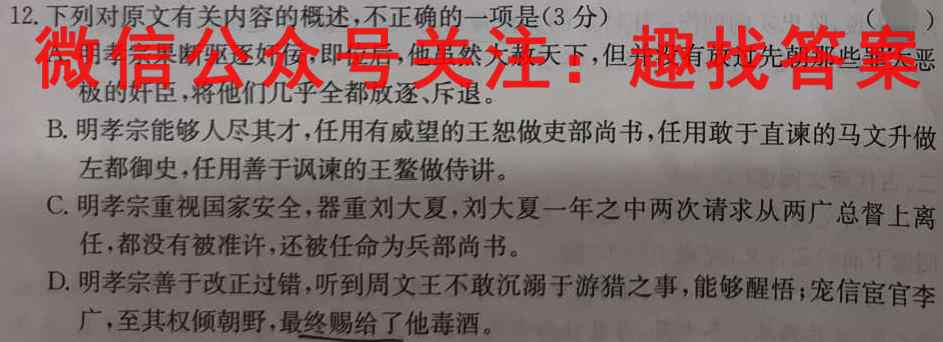 12.下列对原文有关内容的概述,不正确的一项是(3分)()A.明孝宗果断驱逐奸佞,即位后,他虽然大赦天下,但并没有放过先朝那些罪大恶极的奸臣,将他们几乎全都放逐、斥退。B.明孝宗能够人尽其才,任用有威望的王恕做吏部尚书,任用敢于直谏的马文升做左都御史,任用善于讽谏的王鳌做侍讲。C.明孝宗重视国家安全,器重刘大夏,刘大夏一年之中两次请求从两广总督上享任,都没有被准许,还被任命为兵部尚书。D.明孝宗善于改正过错,听到周文王不敢沉溺于游猎之事,能够醒悟;宠信官李广,至其权倾朝野,最终赐给了他毒酒