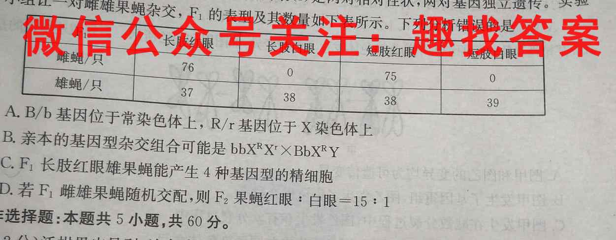 16.果蝇的长肢(B)与短肢(b)、红眼(R)与白眼(r)是两对相对性状,两对基因独立遗传。实验小组让一对雌雄果蝇杂交,F的表型及其数量如下表所示。下列分析错误的是F1A.B/b基因位于常染色体上,R/r基因位于X染色体上B.亲本的基因型杂交组合可能是bbX^RX^rBbX^RYC.F1长肢红眼雄果蝇能产生4种基因型的精细胞D.若F1雌雄果蝇随机交配,则F2果蝇红眼:白眼=15:1