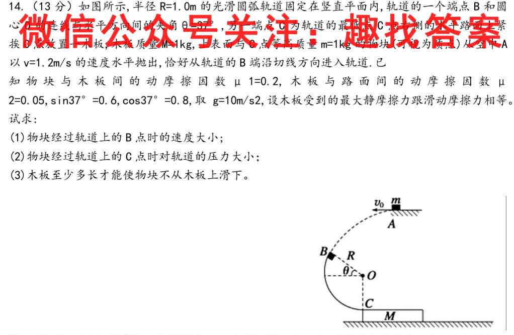 14.(13分)如图所示,半径R=1.0m的光滑圆弧轨道固定在竖直平面内,轨道的一个端点B和圆心0的连线与水平方向间的夹角=37^,另一端点C为轨道的最低点C点右侧的水平路面上紧挨C点放置一木板,木板质量M=1kg,,上表面与C点等高质量m=1kg的物块(可视为质点)从空中A以v=1.2m/s的速度水平抛出,恰好从轨道的B端沿切线方向进入轨道.已知物块与木板间的动摩擦因数=0.2,,木板与路面间的动摩擦因数2=0.05,37^=0.6,37^=0.8,,取g=10m/s2,,设木板受到的最大静摩擦力跟滑动摩擦力相等。试求:(1)物块经过轨道上的B点时的速度大小;(2)物块经过轨道上的C点时对轨道的压力大小;(3)木板至少多长才能使物块不从木板上滑下。