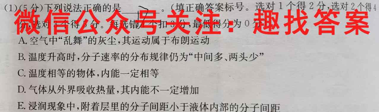 (1)(5分)下列说法正确的是7。。(填正确答案标号。选对1个得2分,选对2个得4分,选对3个得5分。每选错1个扣3分,最低得分为0分)A.空气中“乱舞”的灰尘,其运动属于布朗运动B.温度升高时,分子速率的分布规律仍为“中间多、两头少”C.温度相等的物体,内能一定相等D.气体从外界吸收热量,其内能不一定增加E.浸润现象中,附着层里的分子间距小于液体内部的分子间距