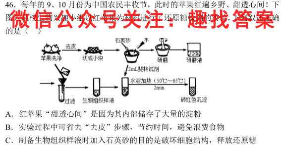 46.每年的9、10月份为中国农民丰收节,此时的苹果红遍乡野、甜透心间!下图为某校生物兴趣小组以红苹果为材料进行了还原糖检测的实验,下列叙述正确的是()A.红苹果“甜透心间”是因为其内部储存了大量的淀粉B.实验过程中可省去“去皮”步骤,节约时间,避免浪费食物C.制备生物组织样液时加入石英砂的目的是破坏细胞结构,释放还原糖
