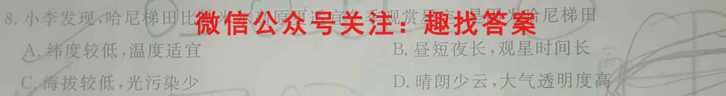 图148.小李发现,哈尼梯田比帕米尔高原更适宜冬季观赏星空,是因为哈尼梯田A.纬度较低,温度适宜B.昼短夜长,观星时间长C.海拔较低,光污染少D.晴朗少云,大气透明度高