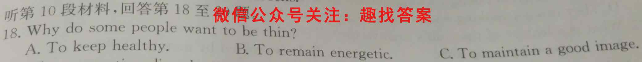 听第10段材料,回答第18至20题。18.Why do some people want to be th in?A.To keep healthy.B.To remain energetic.C.To maintain a good image.